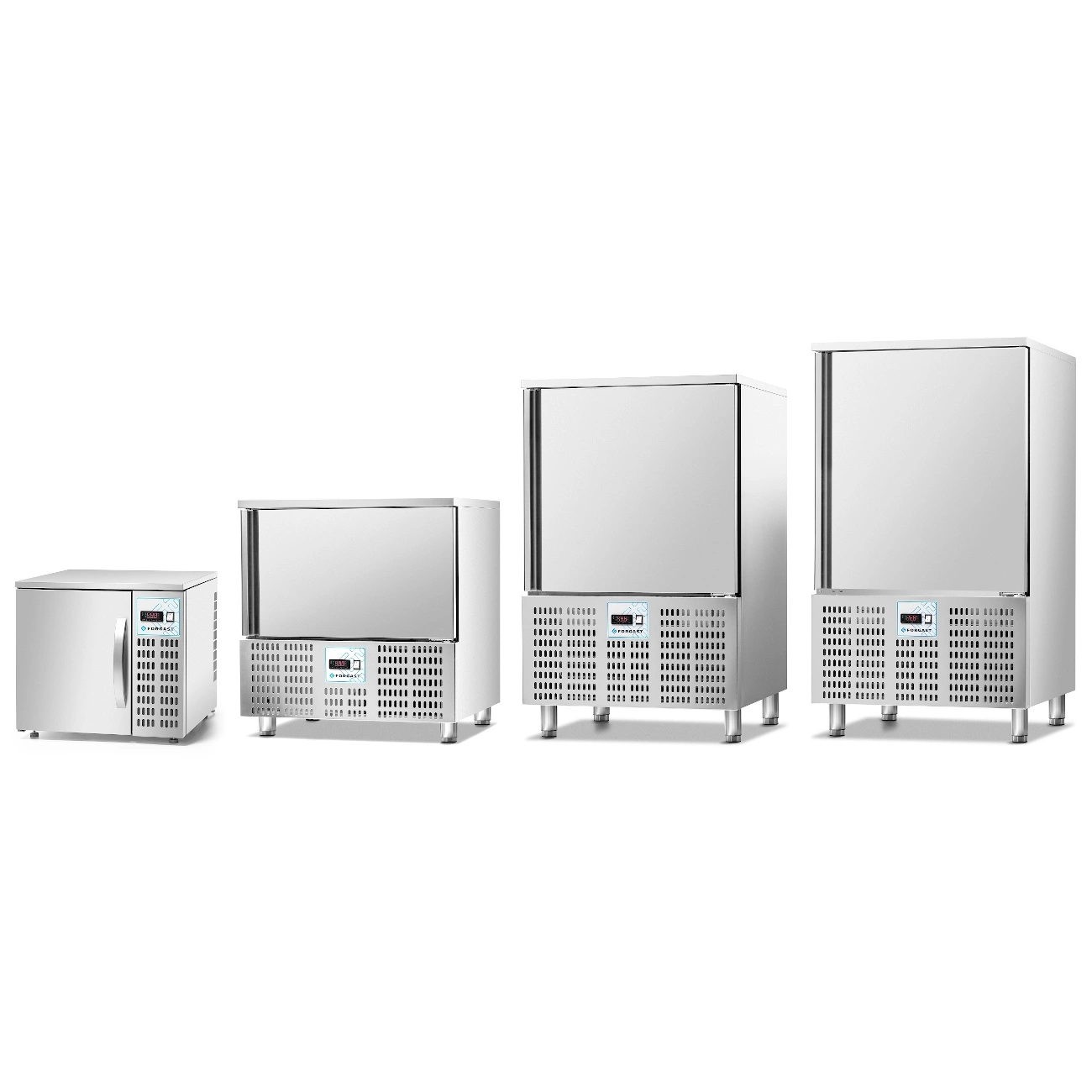 - Vysoký výkon a kapacita: Zařízení je přizpůsobeno pro 10 nádob GN 1/1, což umožňuje současné chlazení nebo mražení velkého množství produktů, až do 50 kg na chladicí cyklus a 30 kg na mrazicí cyklus.