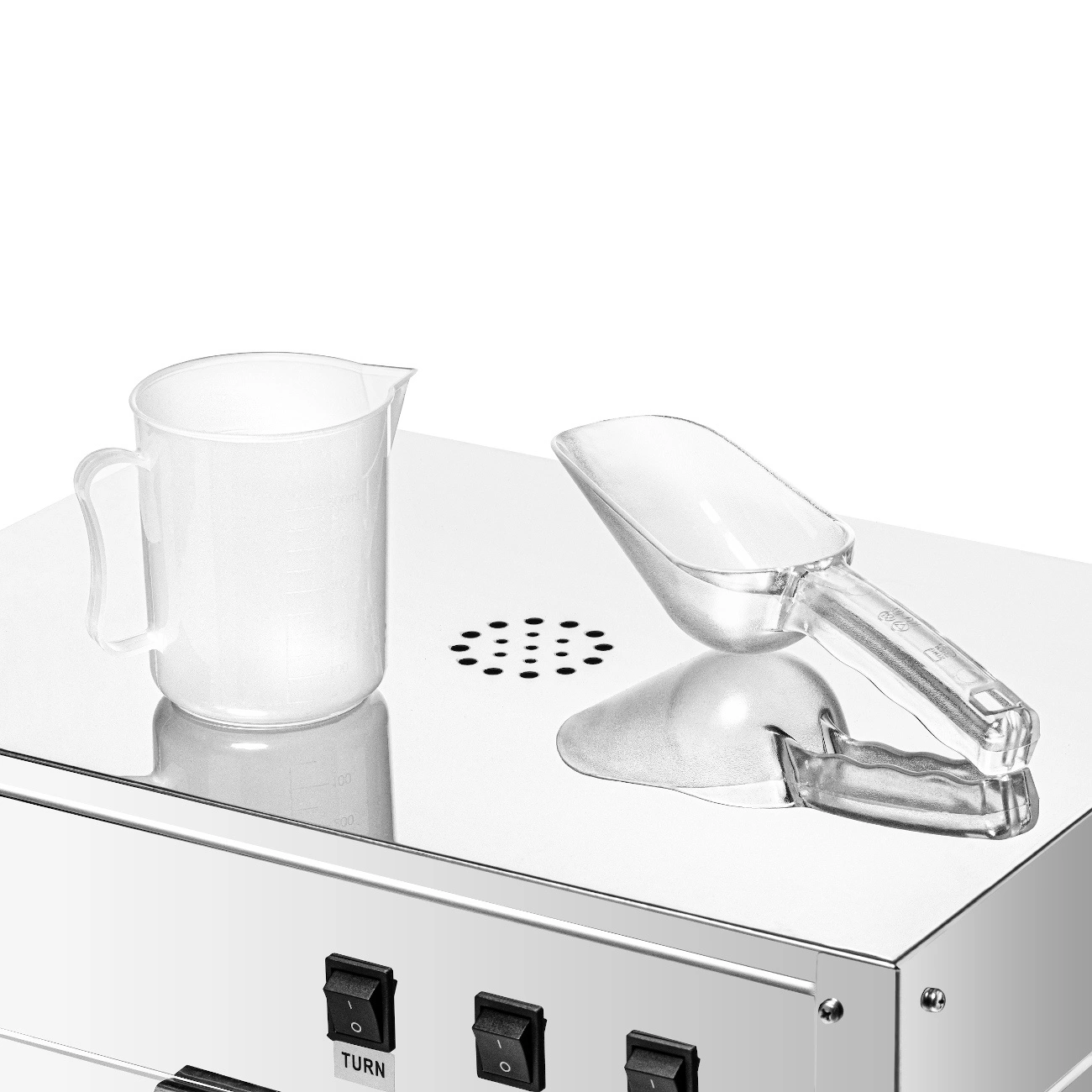 - Výkon: 1,2 kW – Umožňuje rychlou a efektivní přípravu popcornu a zaručuje odpovídající výkon pro profesionální použití.