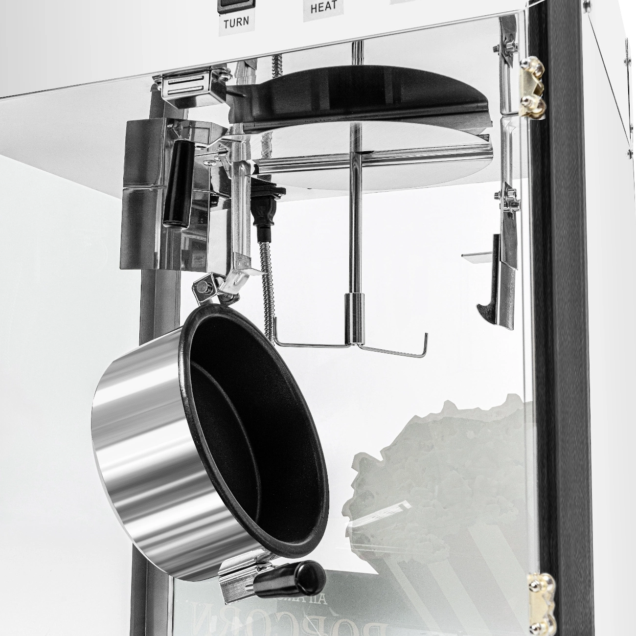 - Přesná kontrola teploty – Vestavěný termostat zajišťuje stálou provozní teplotu, což přispívá k rovnoměrnému ohřevu a kvalitě hotového popcornu.