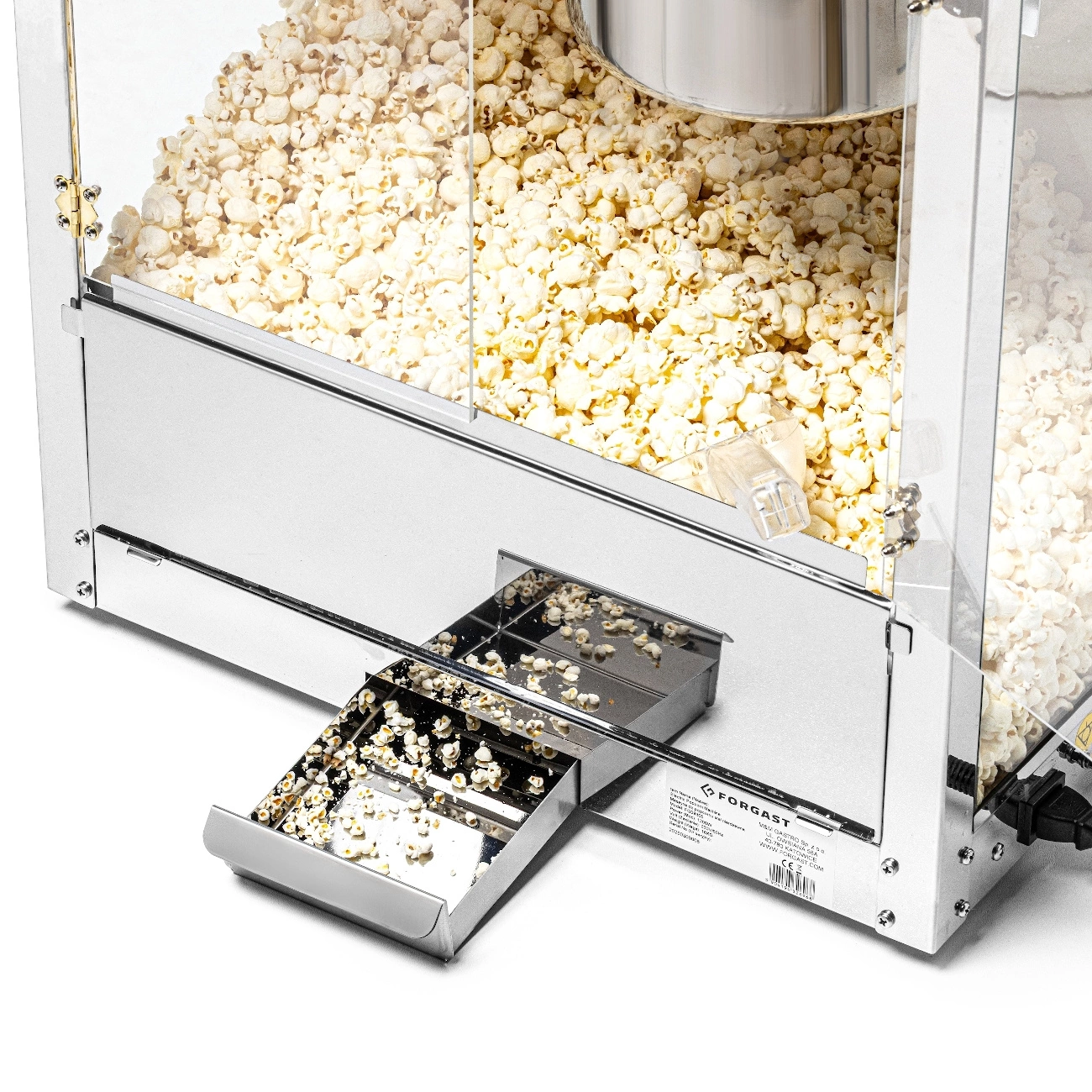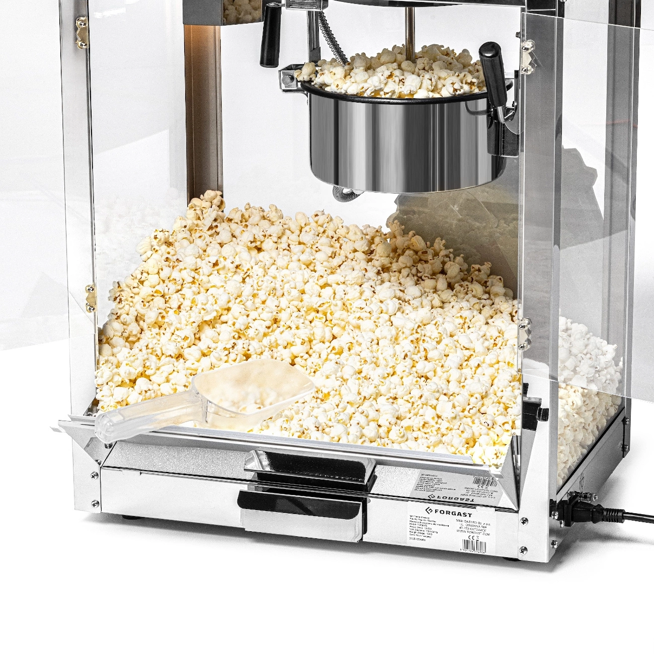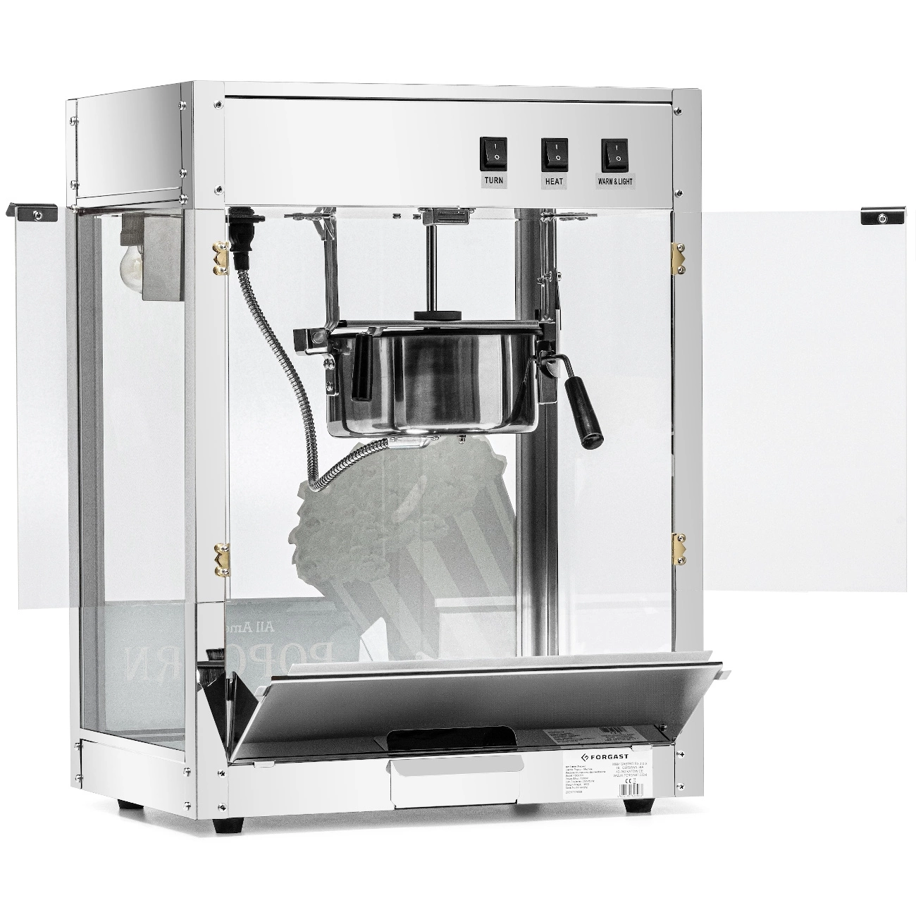 Stroj na popcorn FORGAST FG09305 je ideální pro profesionální použití na místech s vysokou návštěvností, jako jsou kina, eventové stánky, bary nebo food trucky. Zařízení je vybaveno vnitřním osvětlením, které zlepšuje viditelnost hotového popcornu a motivuje zákazníky k nákupu. Součástí sady je lopatka o objemu 220 ml a dávkovač 500 ml, které usnadňují rychlé porcování a servírování produktu. Dvířka z akrylu a stěny z tvrzeného skla zajišťují bezpečnost a umožňují efektní prezentaci popcornu.