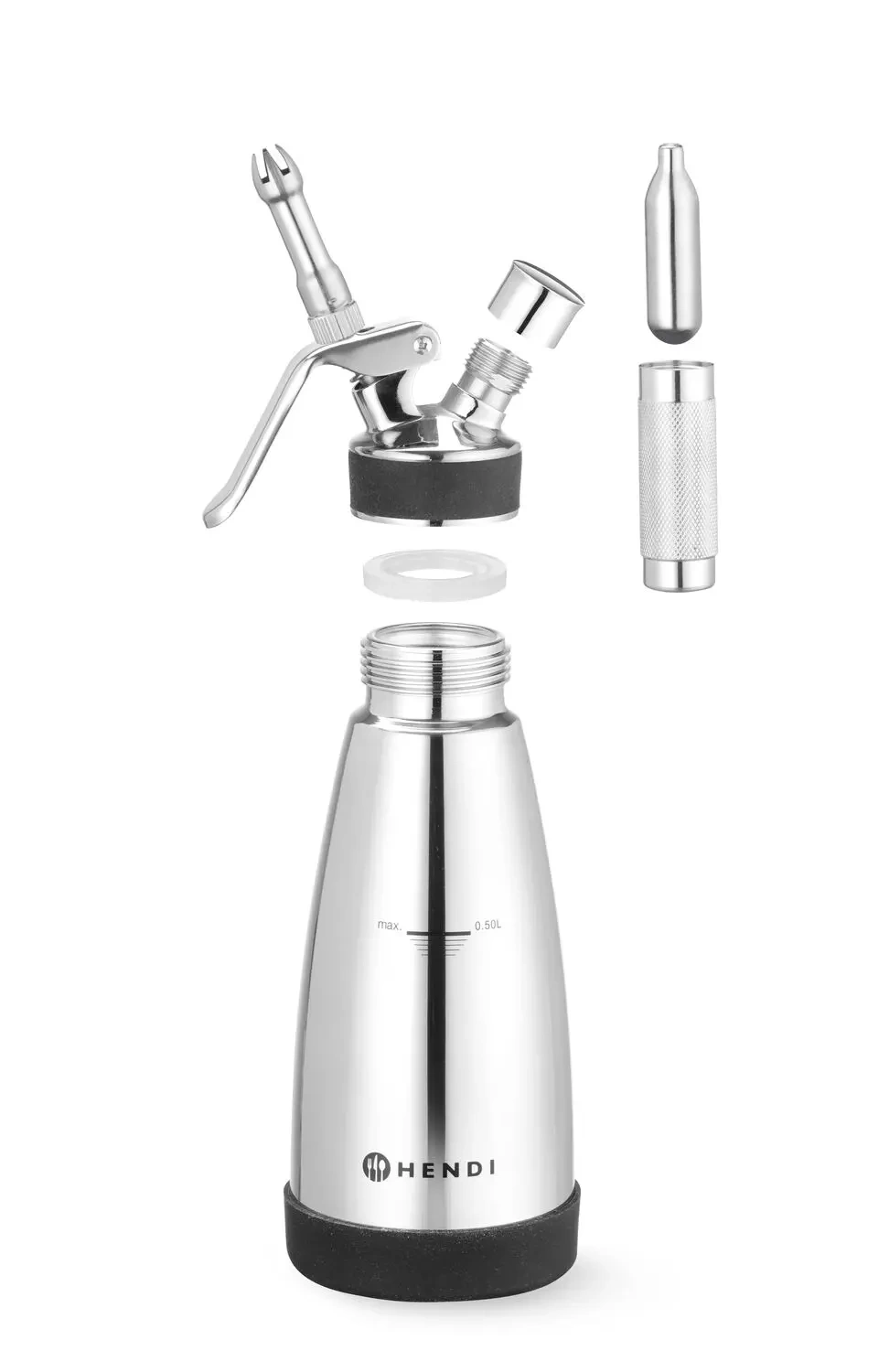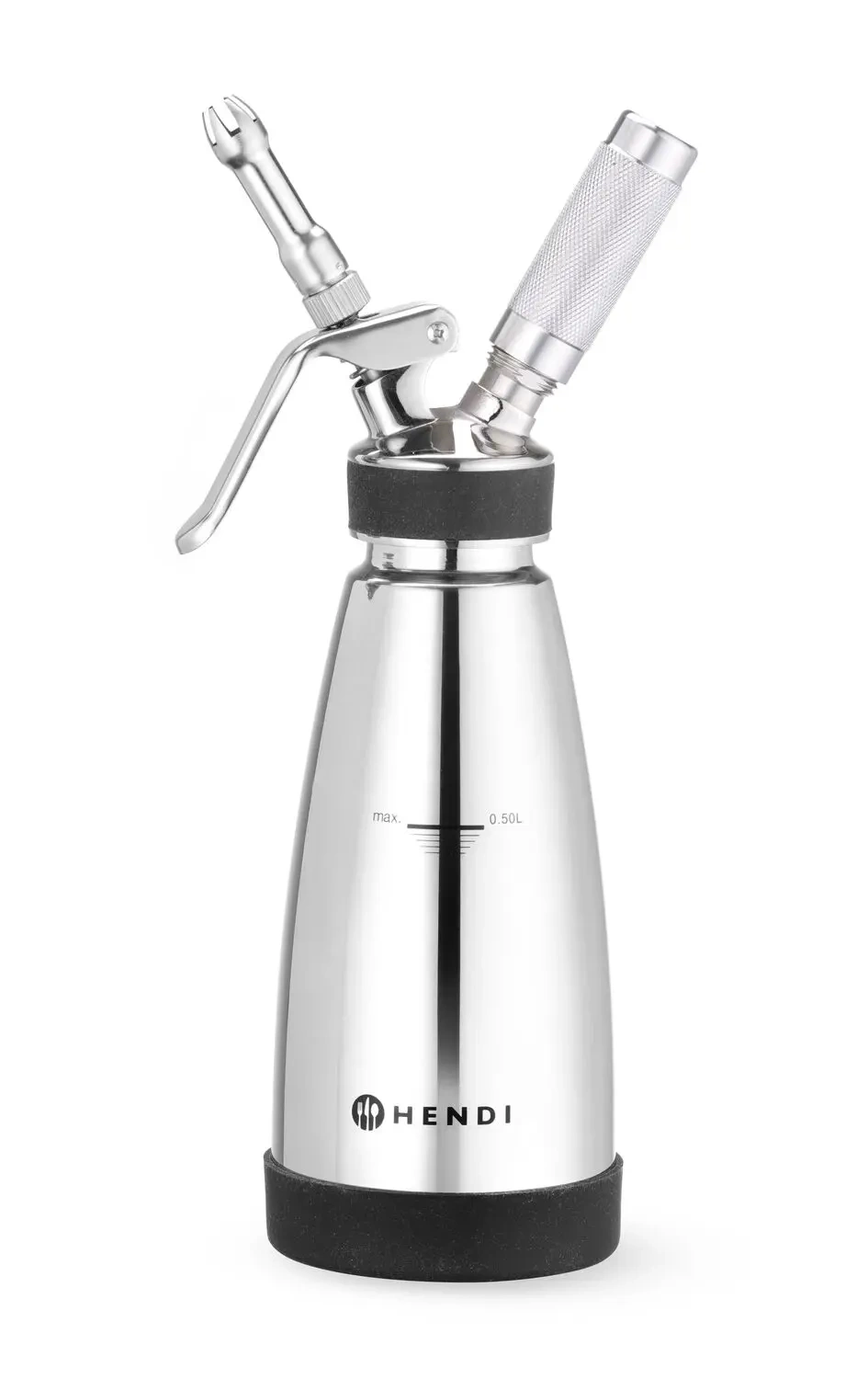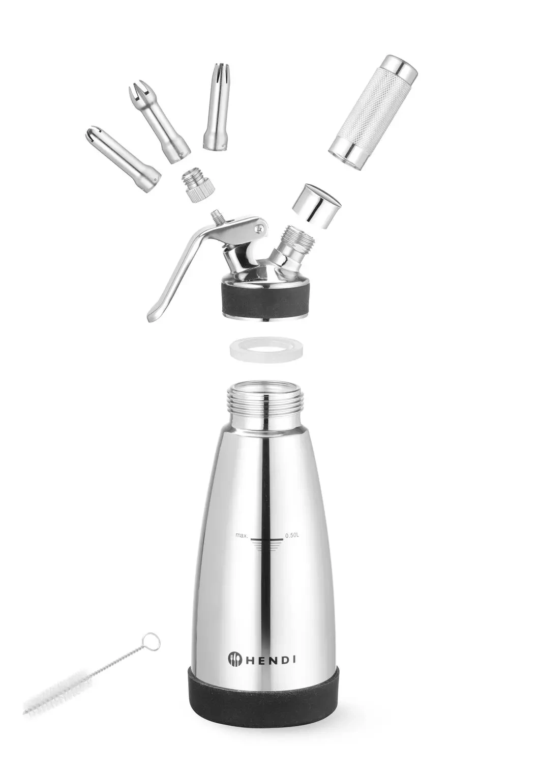 Přístroj je vybaven protiskluzovou silikonovou základnou, která zajišťuje stabilitu při provozu. Sifon podporuje šlehačkové patrony LISS a HENDI pro snadné a účinné napěnění omáček. Součástí sady jsou tři různé nerezové koncovky, plynové víčko a praktický čisticí kartáček. Upozorňujeme, že výrobek není vhodný pro mytí v myčce nádobí.