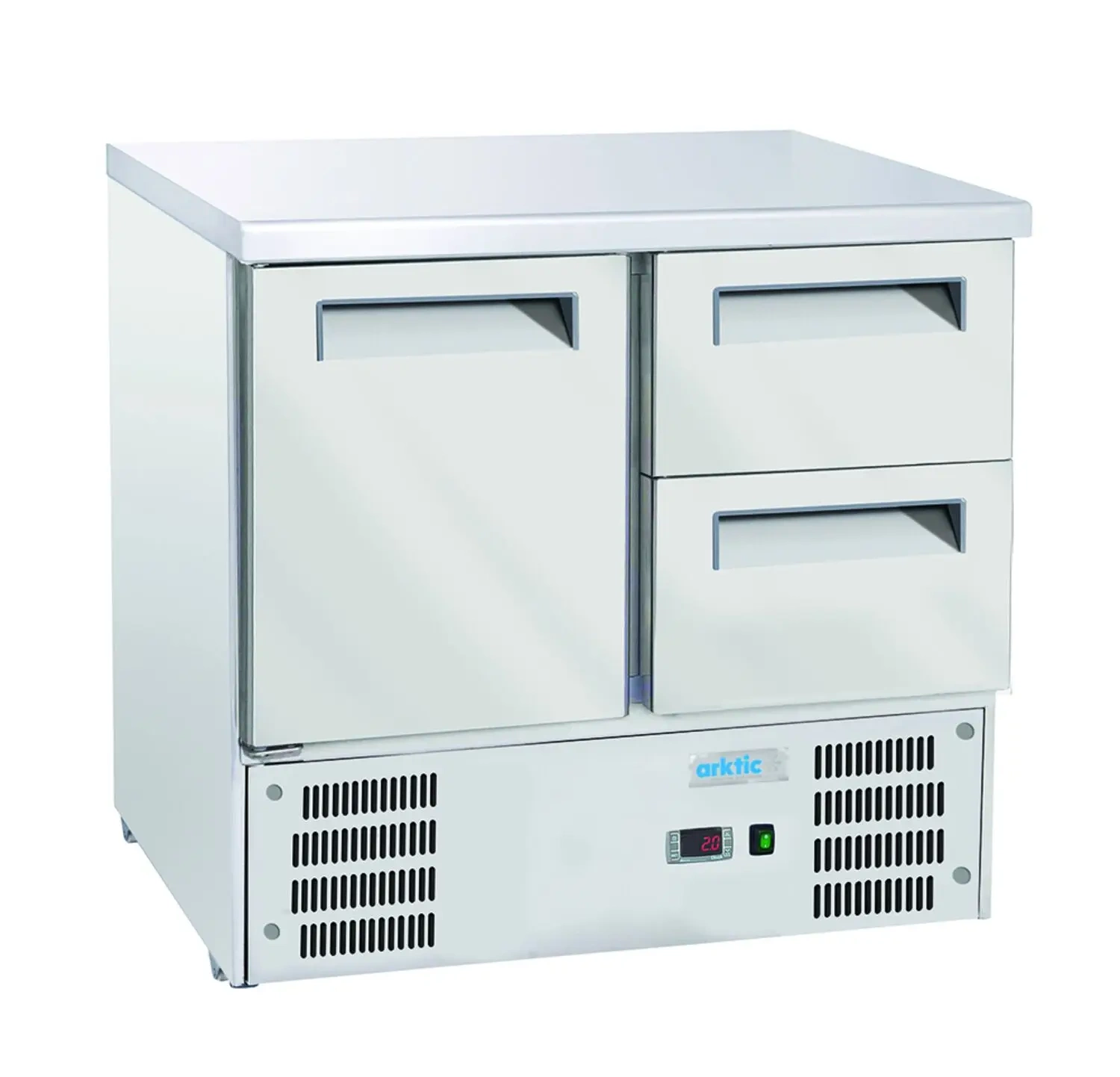 Chladicí stůl s 1 dveřmi a 2 zásuvkami ARKTIC 236765 je spolehlivý spotřebič pro profesionální gastronomii, který poskytuje účinné chlazení, pohodlné používání a pevnou, hygienickou konstrukci. Osvědčí se v restauracích i dalších stravovacích zařízeních, kde je důležitý pracovní komfort a bezpečné skladování produktů.
