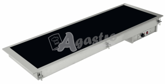 Vestavná sklokeramická ohřevná deska v celonerezovém provedení s mechanickým termostatem a regulací (od +40° do +120°C) s centrálním vypínačem a kontrolkou chodu. Vhodná pro GN1/1. Deska je opatřena polohovatelnými kotvícími prvky, které společně s lemem desky zajišťují přilnavost k celé ploše pracovní desky. Vestavbu je možno příplatkově doplnit o hygienický zákryt (příprava).