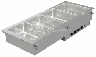 • Vestavná vodní lázeň - dělená je speciálně navržena pro uchovávání, prezentaci a distribuci teplých potravin uložených v hlubokých nerezových GN (dodávány volitelně).