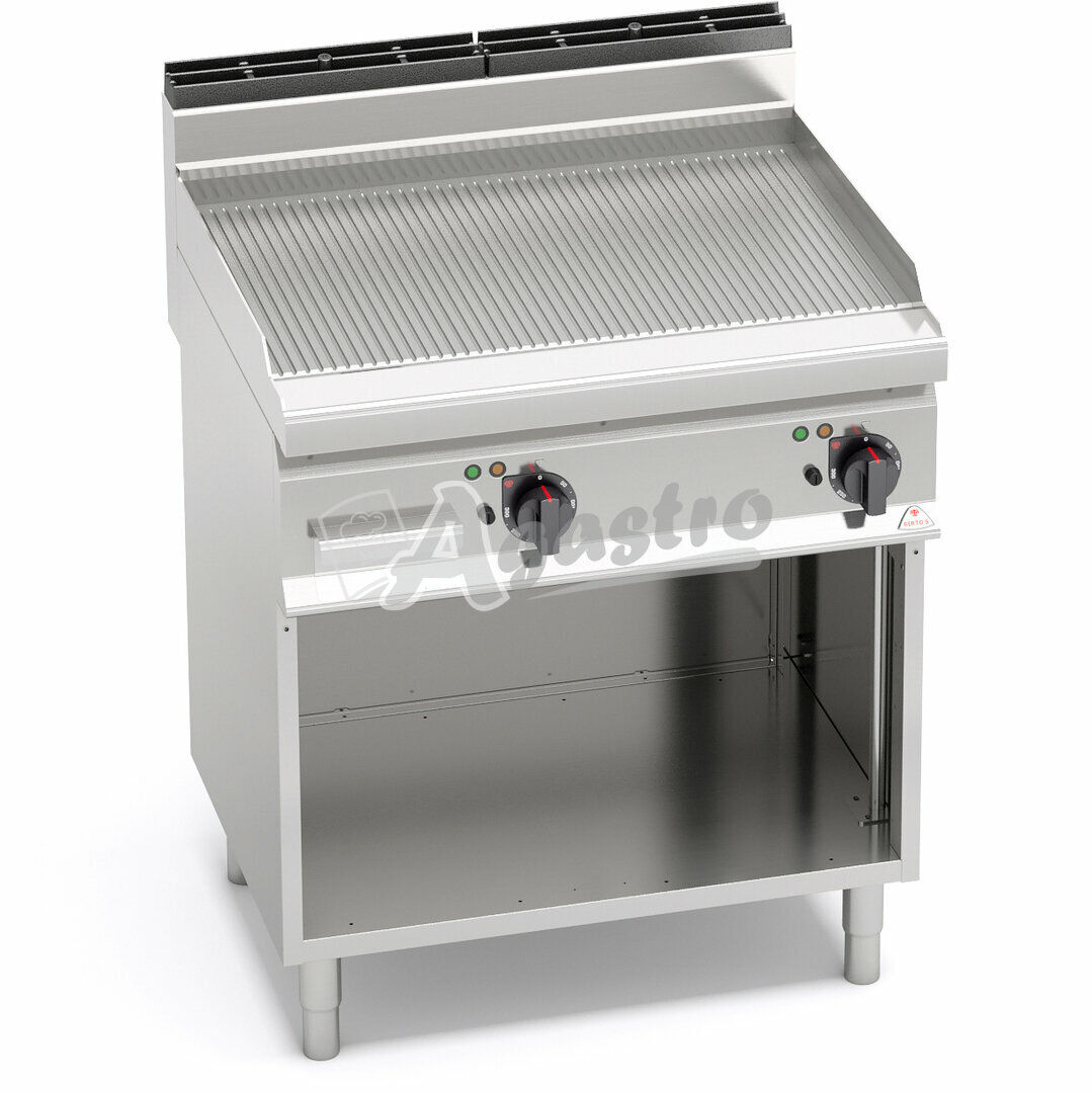 Zesílená grilovací deska s hladkým (rýhovaným) povrchem z oceli a zvýšenými postranními lemy. Topné těleso je umístěno pod grilovací plotnou. Dvě nezávislé zóny, regulační stupně umožňují nastavit teplotu 50-300°C. Kompaktní provedení s otevřeným podstavcem.
