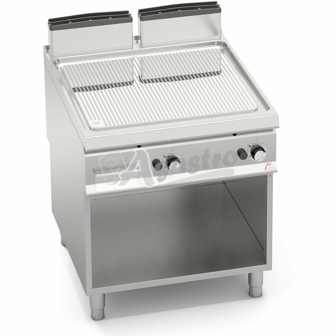 Termostatický ventil 30 až 300°C pro přesnou a bezpečnou regulaci. Termočlánek a chráněný zápalný plamínek. Dvě zóny s nezávislým ovládáním a přesnou regulací teploty. Dvojvrstvá grilovací plotna složená z ocelového plátu a horní vrstvy z nerez oceli AISI 316 s leštěným povrchem, který umožňuje snadné čištění. Nízká úroveň odlesku zvyšuje komfort při práci. Zvýšené postranní lemy. Kompaktní provedení s otevřeným podstavcem. Zvýšený odtah 120 mm není součástí ! Kompletní sortiment plynových a elektrických ploten s různým provedením grilovací plochy. Lze na nich připravovat pokrmy tzv. "kontaktem" a to nejcitlivějším způsobem. Jednotný systém distribuce tepla zaručuje rovnoměrné grilování po celé pracovní ploše, velké energetické úspory a zlepšení pracovního prostředí. Při grilování se přirozeně tvoří zbytkový olej, který je odváděn a shromažďován ve velké odpadní nádobce. Teflonová zátka, odolná vůči vysokým teplotám není součástí smažící plotny.